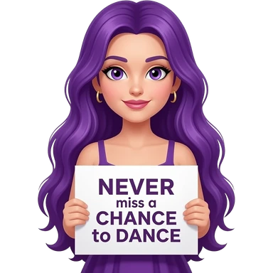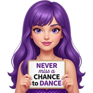 sexy girl with long purple hair and purple eyes wearing a dress holding a NEVER miss a CHANCE to DANCE sign emoji