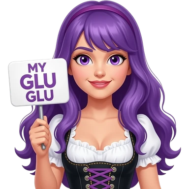 sexy girl with long purple hair and purple eyes wearing a dirndl holding a MY GLU GLU sign emoji