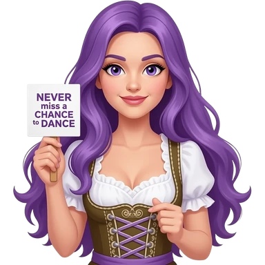sexy girl with long purple hair and purple eyes wearing a dirndl holding a NEVER miss a CHANCE to DANCE sign emoji