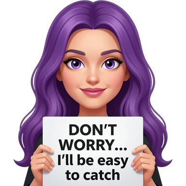 sexy girl with long purple hair and purple eyes holding a DON'T WORRY... I'll be easy to catch sign emoji