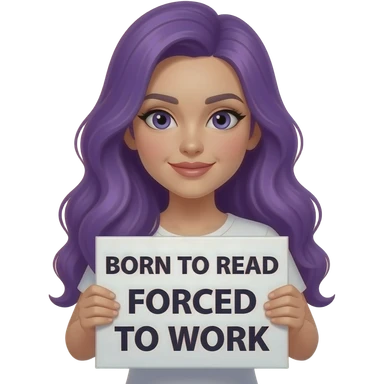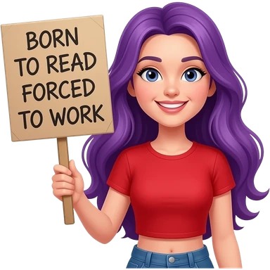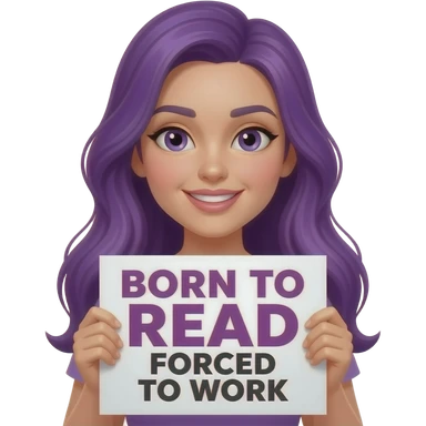 girl with long purple hair with a BORN TO READ Forced to work sign emoji