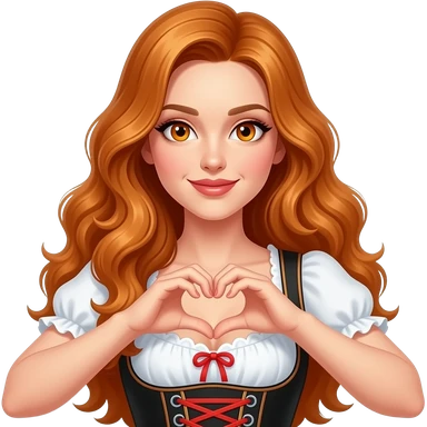 sexy girl with long wavy ginger hair and ginger eyes says wearing a dirndl and makes a heart with her finges emoji