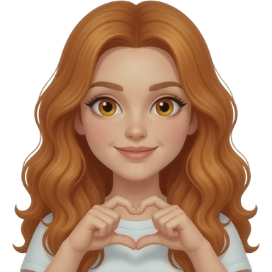 sexy girl with long wavy ginger hair and ginger eyes makes a heart with her fingers emoji