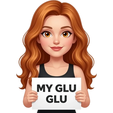 sexy girl with long wavy ginger hair and ginger eyes wearing a black tanktop is holding a white colored sign with MY GLU GLU written on it emoji