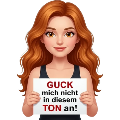 sexy girl with long wavy ginger hair and ginger eyes wearing a black tanktop is holding a white sign with GUCK mich nicht in diesem TON an! written on it emoji