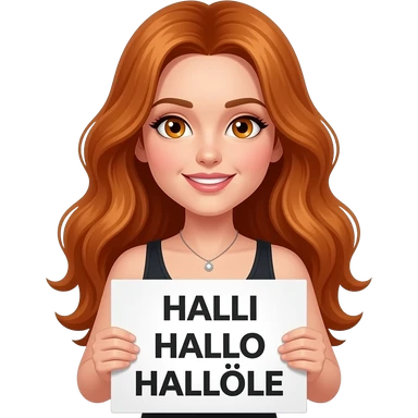 sexy girl with long wavy ginger hair and ginger eyes wearing a black tanktop is holding a white sign with HALLI HALLO HALLÖLE written on it emoji