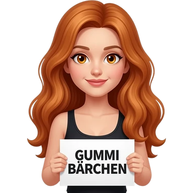 sexy girl with long wavy ginger hair and ginger eyes wearing a black tanktop is holding a white sign with GUMMI BÄRCHEN written on it emoji