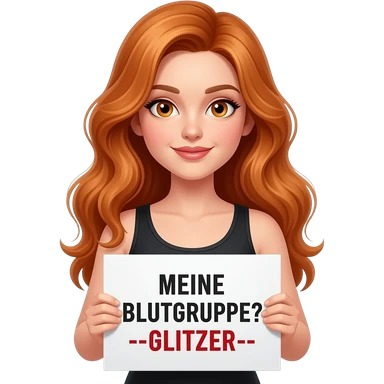 sexy girl with long wavy ginger hair and ginger eyes wearing a black tanktop is holding a white sign with MEINE BLUTGRUPPE? --GLITZER-- written on it emoji