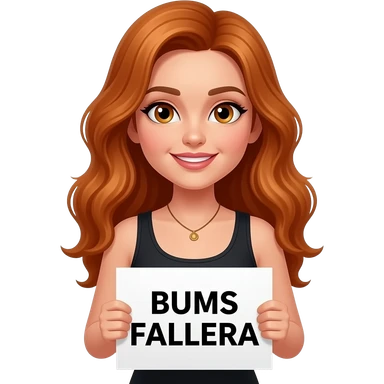 sexy girl with long wavy ginger hair and ginger eyes wearing a black tanktop is holding a white sign with BUMS FALLERA written on it emoji