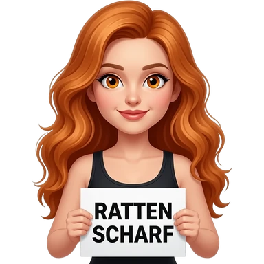 sexy girl with long wavy ginger hair and ginger eyes wearing a black tanktop is holding a white sign with RATTEN SCHARF written on it emoji
