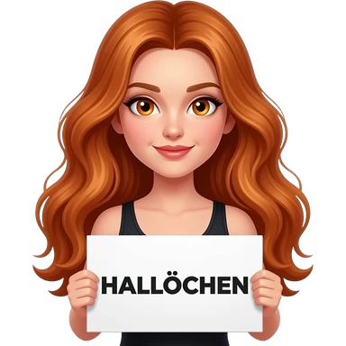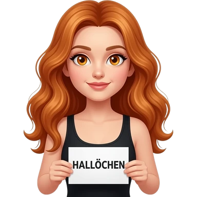 sexy girl with long wavy ginger hair and ginger eyes wearing a black tanktop is holding a white sign with HALLÖCHEN written on it emoji