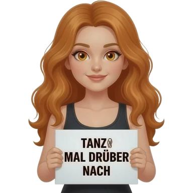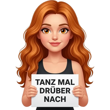 sexy girl with long wavy ginger hair and ginger eyes wearing a black tanktop is holding a white colored sign with TANZ MAL DRÜBER NACH written on it emoji