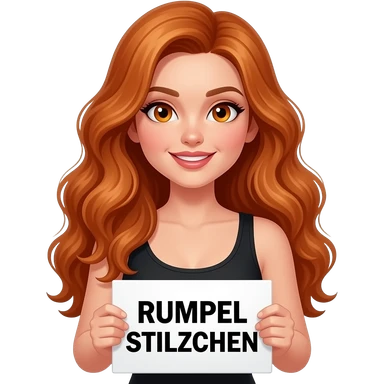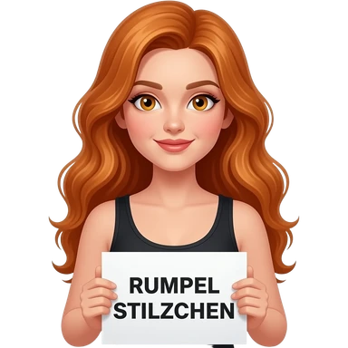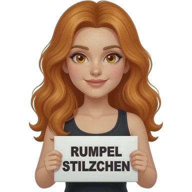 sexy girl with long wavy ginger hair and ginger eyes wearing a black tanktop is holding a white colored sign with RUMPEL STILZCHEN written on it emoji