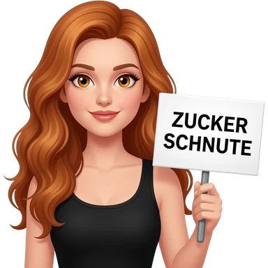sexy girl with long wavy ginger hair and ginger eyes wearing a black tanktop is holding a white colored sign with ZUCKERSCHNUTE written on it emoji