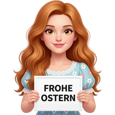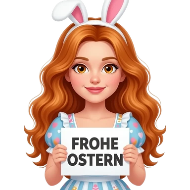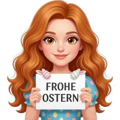 sexy girl with long wavy ginger hair and ginger eyes wearing a easter dress is holding a white colored sign with FROHE OSTERN written on it emoji