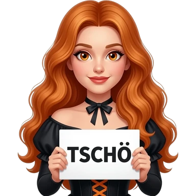 sexy girl with long wavy ginger hair and ginger eyes wearing a halloween dress is holding a white colored sign with TSCHÖ written on it emoji