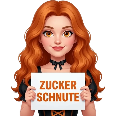 sexy girl with long wavy ginger hair and ginger eyes wearing a halloween dress is holding a white colored sign with ZUCKER SCHNUTE written on it emoji