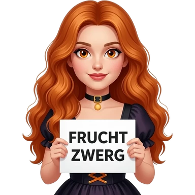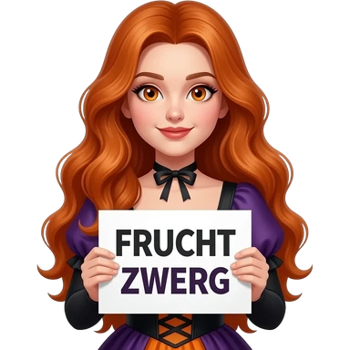 sexy girl with long wavy ginger hair and ginger eyes wearing a halloween dress is holding a white colored sign with FRUCHT ZWERG written on it emoji