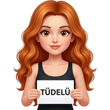sexy girl with long wavy ginger hair and ginger eyes wearing a black tanktop is holding a white colored sign with TÜDELÜ written on it emoji