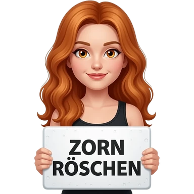 sexy girl with long wavy ginger hair and ginger eyes wearing a black tanktop is holding a white colored sign with ZORN RÖSCHEN written on it emoji