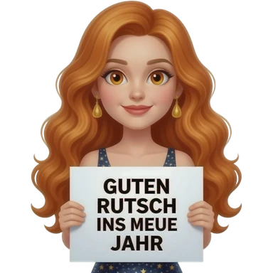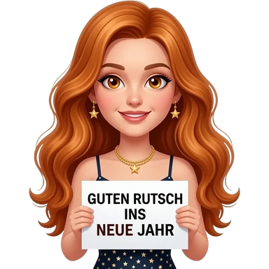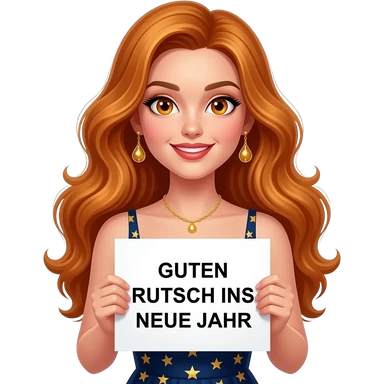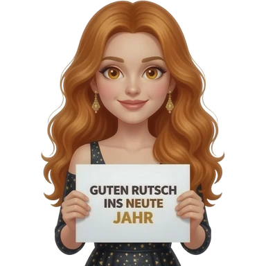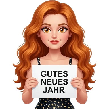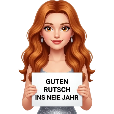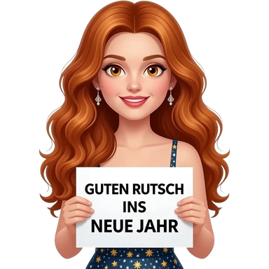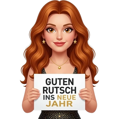 sexy girl with long wavy ginger hair and ginger eyes wearing a new years eve dress is holding a white colored sign with GUTES NEUES JAHR written on it emoji