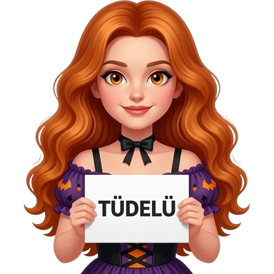 sexy girl with long wavy ginger hair and ginger eyes wearing a halloween dress is holding a white colored sign with TÜDELÜ written on it emoji