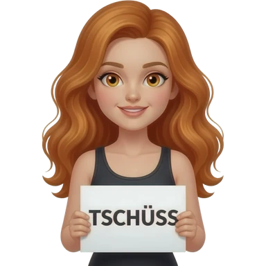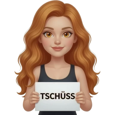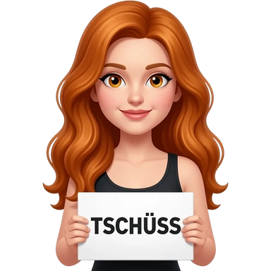 sexy girl with long wavy ginger hair and ginger eyes wearing a black tanktop is holding a white colored sign with TSCHÜSS written on it emoji