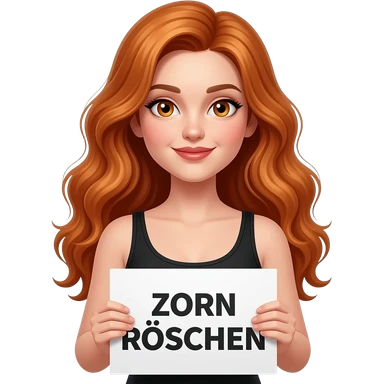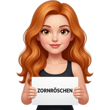 sexy girl with long wavy ginger hair and ginger eyes wearing a black tanktop is holding a white colored sign with ZORNRÖSCHEN written on it emoji
