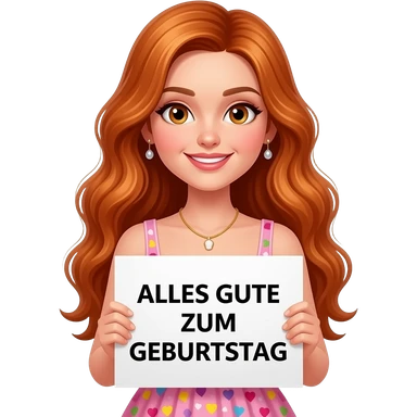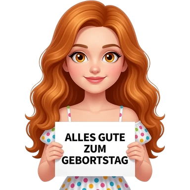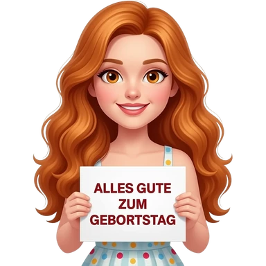 sexy girl with long wavy ginger hair and ginger eyes wearing a birthday dress is holding a white colored sign with ALLES GUTE ZUM GEBURTSTAG written on it emoji
