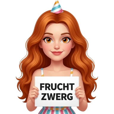 sexy girl with long wavy ginger hair and ginger eyes wearing a birthday dress is holding a white colored sign with FRUCHT ZWERG written on it emoji