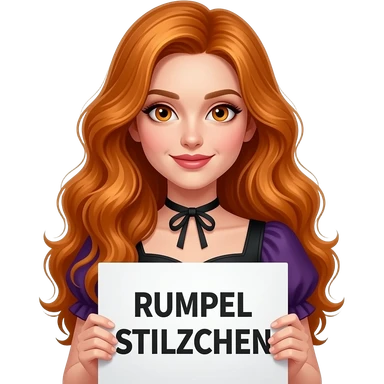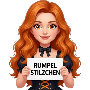 sexy girl with long wavy ginger hair and ginger eyes wearing a halloween dress is holding a white colored sign with RUMPEL STILZCHEN written on it emoji