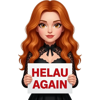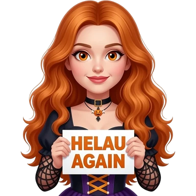 sexy girl with long wavy ginger hair and ginger eyes wearing a halloween dress is holding a white colored sign with HELAU AGAIN written on it emoji