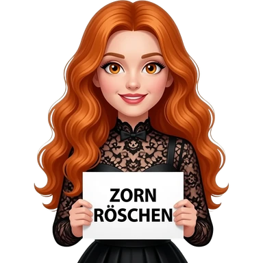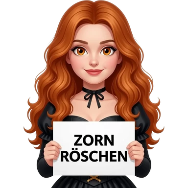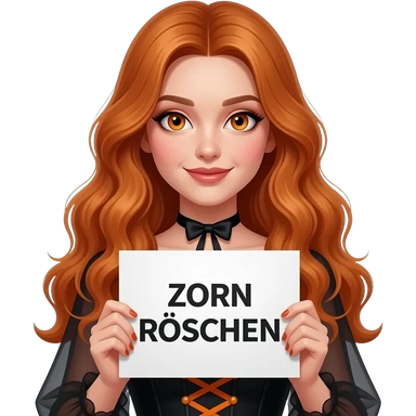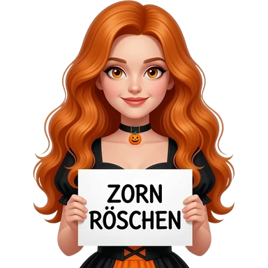 sexy girl with long wavy ginger hair and ginger eyes wearing a halloween dress is holding a white colored sign with ZORN RÖSCHEN written on it emoji