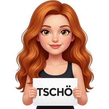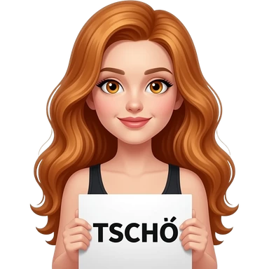 sexy girl with long wavy ginger hair and ginger eyes wearing a black tanktop is holding a white colored sign with TSCHÖ written on it emoji