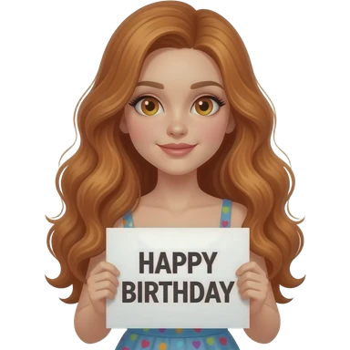sexy girl with long wavy ginger hair and ginger eyes wearing a birthday dress is holding a white colored sign with HAPPY BIRTHDAY written on it emoji