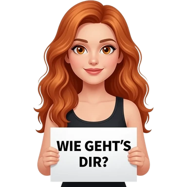 sexy girl with long wavy ginger hair and ginger eyes wearing a black tanktop is holding a white colored sign with WIE GEHT'S DIR? written on it emoji