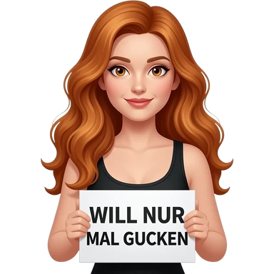 sexy girl with long wavy ginger hair and ginger eyes wearing a black tanktop is holding a white colored sign with WILL NUR MAL GUCKEN written on it emoji
