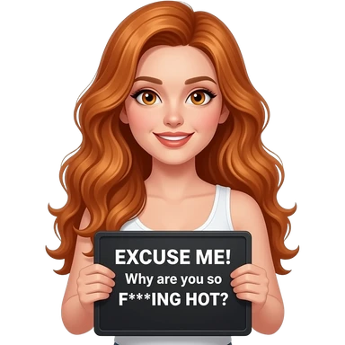sexy girl with long wavy ginger hair and ginger eyes wearing a white tanktop is holding a black colored sign with EXCUSE ME! Why are you so F***ING HOT?written on it emoji