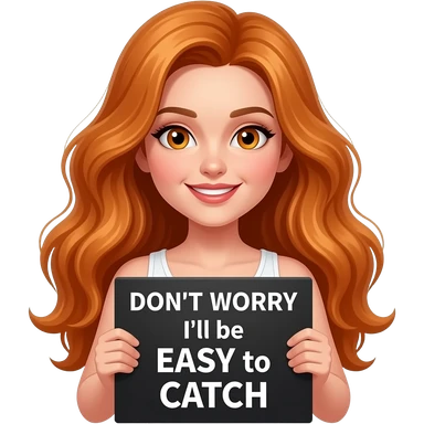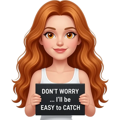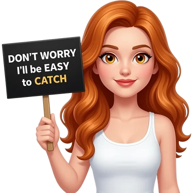 sexy girl with long wavy ginger hair and ginger eyes wearing a white tanktop is holding a black colored sign with DON'T WORRY... I'll be EASY to CATCH written on it emoji