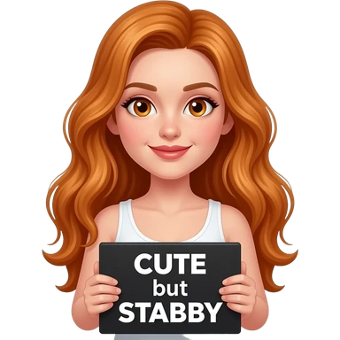 sexy girl with long wavy ginger hair and ginger eyes wearing a white tanktop is holding a black colored sign with CUTE but STABBY written on it emoji
