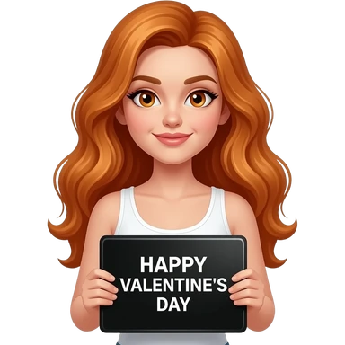 sexy girl with long wavy ginger hair and ginger eyes wearing a white tanktop is holding a black colored sign with HAPPY VALENTINE'S DAY written on it emoji