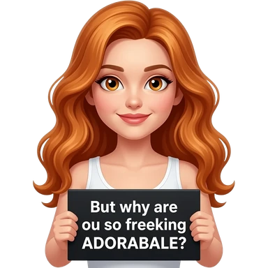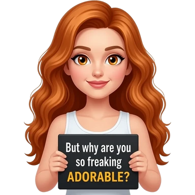 sexy girl with long wavy ginger hair and ginger eyes wearing a white tanktop is holding a black colored sign with But why are ou so freaking ADORABALE? written on it emoji