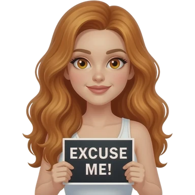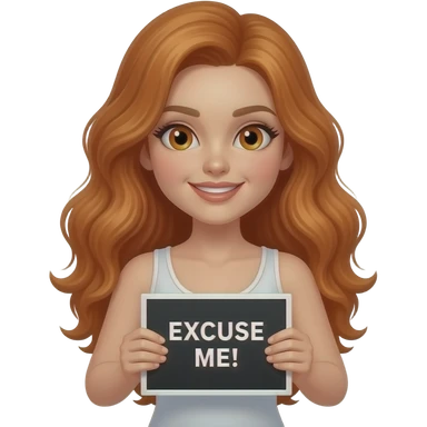sexy girl with long wavy ginger hair and ginger eyes wearing a white tanktop is holding a black colored sign with EXCUSE ME! written on it emoji