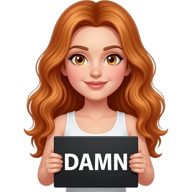 sexy girl with long wavy ginger hair and ginger eyes wearing a white tanktop is holding a black colored sign with DAMN written on it emoji