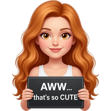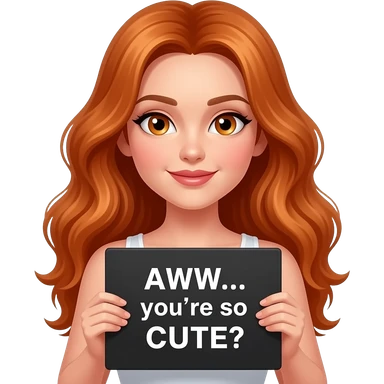 sexy girl with long wavy ginger hair and ginger eyes wearing a white tanktop is holding a black colored sign with AWW... you're so CUTE written on it emoji