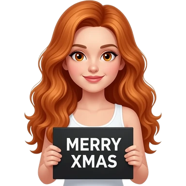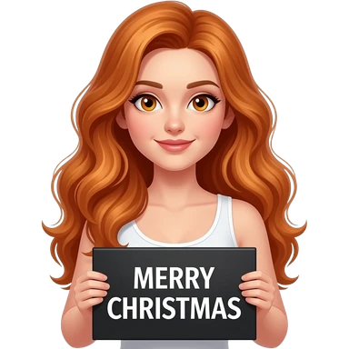 sexy girl with long wavy ginger hair and ginger eyes wearing a white tanktop is holding a black colored sign with MERRY XMAS written on it emoji