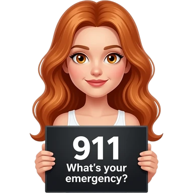 sexy girl with long wavy ginger hair and ginger eyes wearing a white tanktop is holding a black colored sign with 911 What's your emergency? written on it emoji