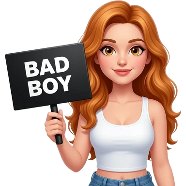 sexy girl with long wavy ginger hair and ginger eyes wearing a white tanktop is holding a black colored sign with BAD BOY written on it emoji