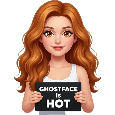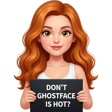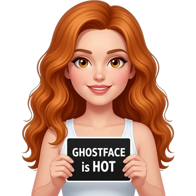 sexy girl with long wavy ginger hair and ginger eyes wearing a white tanktop is holding a black colored sign with GHOSTFACE is HOT written on it emoji