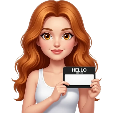sexy girl with long wavy ginger hair and ginger eyes wearing a white tanktop is holding a black colored sign with HELLO written on it emoji